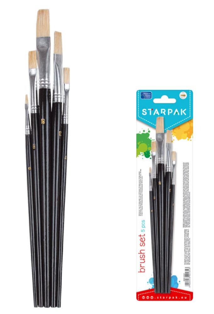 Zestaw płaskich pędzli szkolnych. 5 grubości - od 2 do 16 mm. Pędzle płaskie są idealne do malowania farbami plakatowymi i akrylowymi.