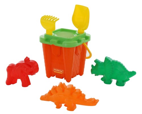 Zestaw zawiera: iaderko-zamek duże Nr2, sito-twierdza duże, łopatka Nr5, grabki Nr5, foremki (mamut + dinozaur Nr1 + dinozaur Nr2). Dla dzieci od 1 roku życia.