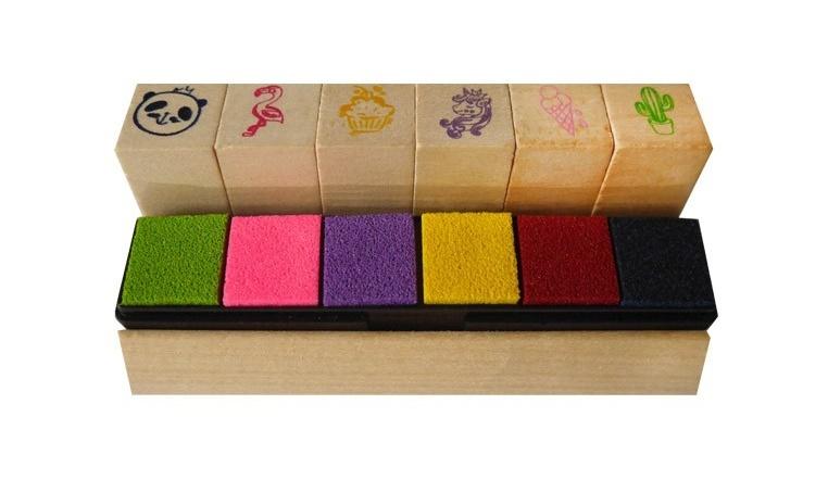 Pieczątki drewniane - 6 sztuk z kolorowym tuszem.