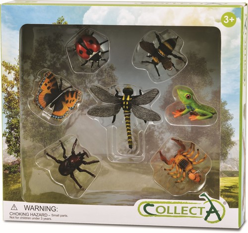 Zestaw 7 figurek owadów w opakowaniu Wszystkie modele CollectA są wykonane zgodnie z najwyższymi standardami i wykonane z wysokiej jakości materiałów, bezpiecznych dla zdrowia. W skład zestawu wchodzi: Ważka Szklarnik Leśny Skorpion żółty Motyl Rusałka Pokrzywnik Biedronka Trzmiel Żaba czerwonooka Rzekotka Drzewna Rohatyniec Nosorożec