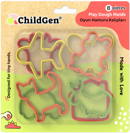 Zestaw foremek do modelowania ciastoliny zawiera 8 różnorodnych kształtów, w tym zwierzątka czy pojazdy.
