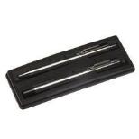 Zestaw pióro + długopis w kolorze srebrnym, zapakowane w pudełeczko.