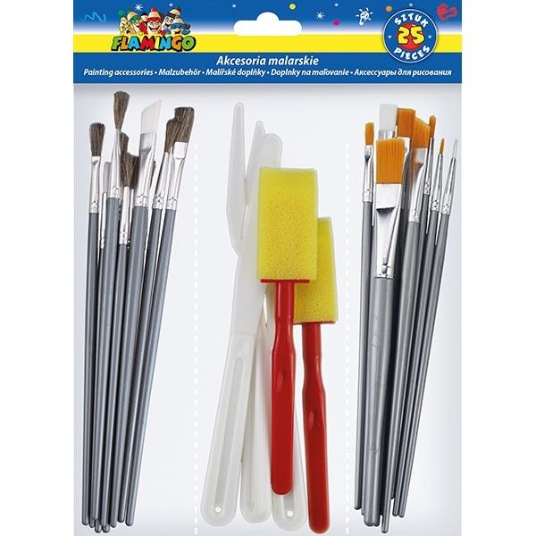 Zestaw akcesoriów artystycznych: pędzli, pędzli gąbkowych i szpachelek malarskich plastikowych 25szt.
