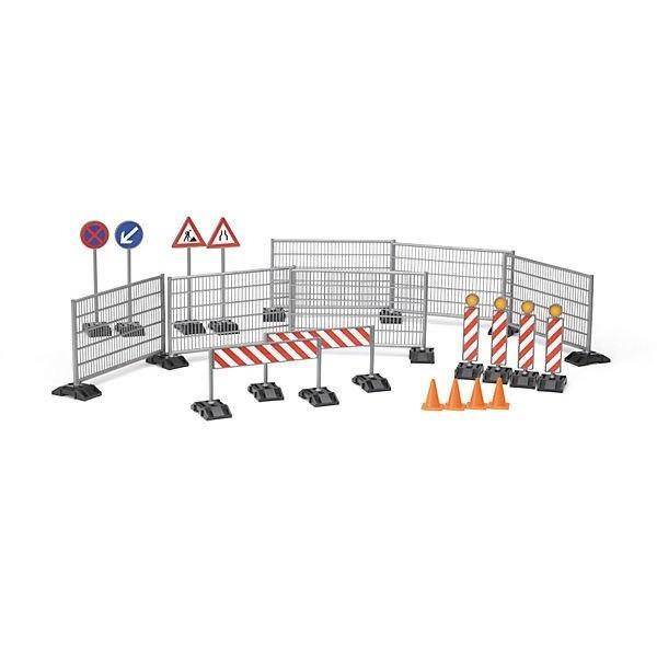 Zestaw akcesoriów budowlanych Bruder 62007: ogrodzenia, znaki i słupy.