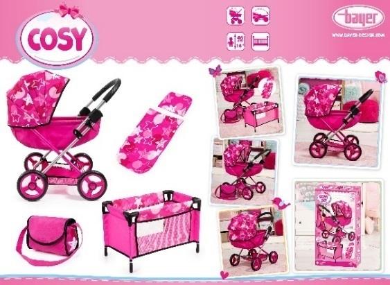 Zestaw akcesoriów dla lalek skladajacy sie z: wózka dla lalek Cosy (wraz z poduszka i kocykiem), lózeczka dla lalki oraz praktycznej torby na ramie. Wózek dla lalek COSY posiada piekny design, a dzieki przytulnemu kocykowi i dopasowanej poduszce zapewni lalce spokojne i slodkie sny. W wózku zmieszcza sie lalki o wysokosci do 46 cm. Dwukolorowa rama z nowoczesnymi kolami pasujacymi do koloru i olsniewajaca oslona przeciw sloncu nadaja wózkowi przepiekny wyglad. Dzieki duzym oponom wózek dla lalek COSY jest latwy w prowadzeniu nawet po bardzo nierównym terenie. Dodatkowo wózek mozna prosto zlozyc, pomaga to w transporcie Ponadto zintegrowany kosz zapewnia wiele miejsca do przechowywania wszystkiego, czego potrzebujesz. Dzieki poduszce i kocykowi lalka Handle height (cm): 58, Measurements (cm): 63 x 34 x 58