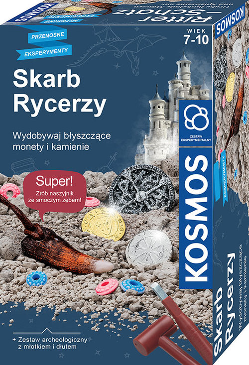 Jak prawdziwy archeolog wydobywaj monety, medaliony, kamienie, a nawet smoczy ząb. Zanurz się w mistycznym średniowiecznym świecie i poznaj ekscytujące opowieści o rycerzach i smokach. Przy użyciu młotka i dłuta wydobywaj znaleziska z gipsu, znajdź niebezpieczny smoczy ząb, zaproś przyjaciół do gry w średniowieczne kości. W skład zestawu wchodzi: - młotek - dłuto - gąbka - blok gipsowy z ukrytymi skarbami - 2 metalowe monety - smoczy ząb - naszyjnik - medalion - 8 kamieni - instrukcja ze wskazówkami i ciekawostkami.