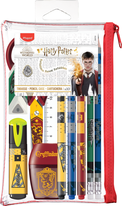 Zestaw 10 "magicznych" akcesoriów niezbędnych do osiągnięcia sukcesu w szkole i domu z kolekcji Harry Potter. Motyw <> bardzo modny i lubiany wśród nastolatków; wzory Gryffindor, Hufflepuff, Ravenclaw i Slytherin.