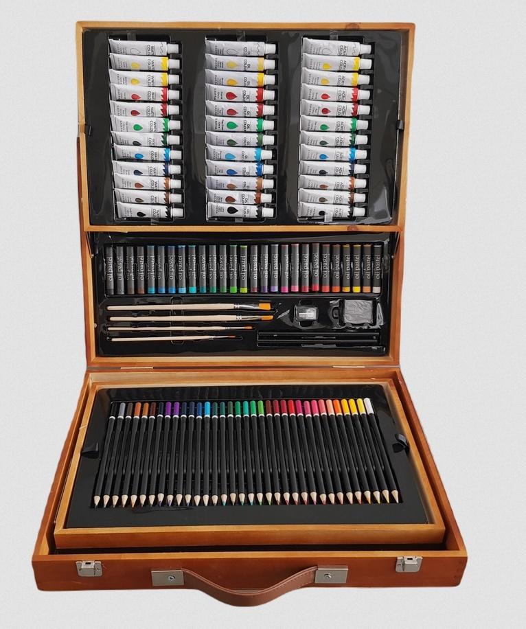 Idealnie sprawdzi się jako prezent dla małego artysty.Elegancka drewniana skrzynia 168 szt., która zawiera:
