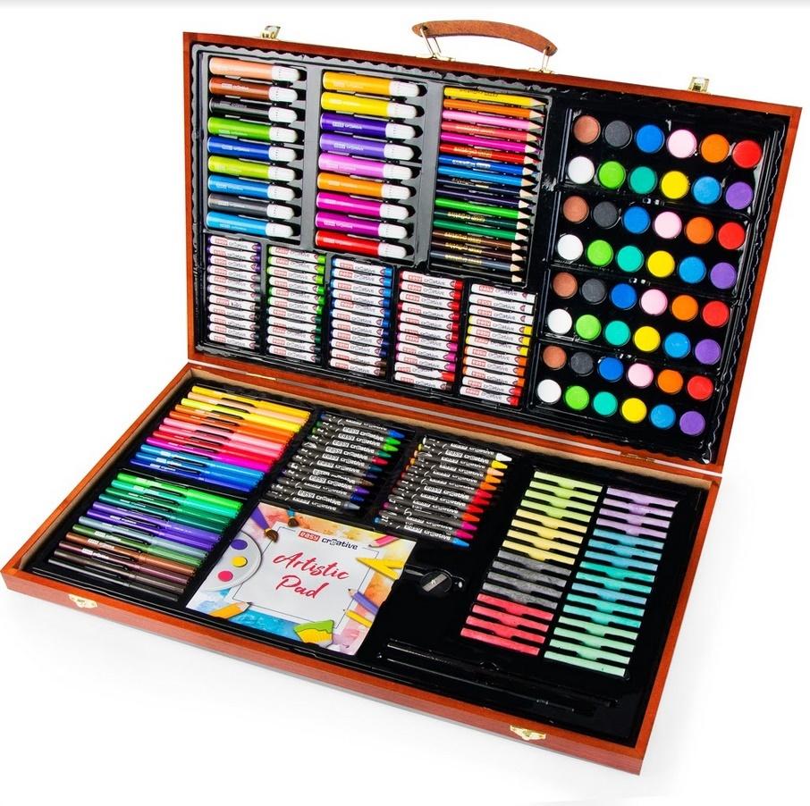 Zestaw artystyczny to doskonały początek przygody młodego artysty. Komplet jest funkcjonalny i składa się łącznie z 226 praktycznych elementów. Mnogość przyborów sprawi, że każde użycie zestawu artystycznego będzie doskonałą podróżą w świat sztuki. W skład zestawu wchodzą 48 farbek akwarelowych, 4 paletki, 17 mini kredek, 18 mini flamastrów, 55 pasteli olejnych, 32 kredy, 24 kredki świecowe, 24 flamastry, 1 temperówka, 1 ołówek HB, 1 pędzelek, 1 notatnik . Wykonane z najwyższej jakości materiałów przybory mają szeroką gamę kolorystyczną, co dodatkowo ułatwi wykonywanie prac plastycznych czy codzienny użytek. Całość została umieszczona w eleganckiej i praktycznej walizce, ułatwiającej przenoszenie i dodatkowo podbijającej walory estetyczne całego zestawu. Zestaw do malowania i rysowania to nie tylko obowiązkowy element wyposażenia każdego ucznia czy miłośnika kreatywnych zadań, ale także doskonały pomysł na prezent.