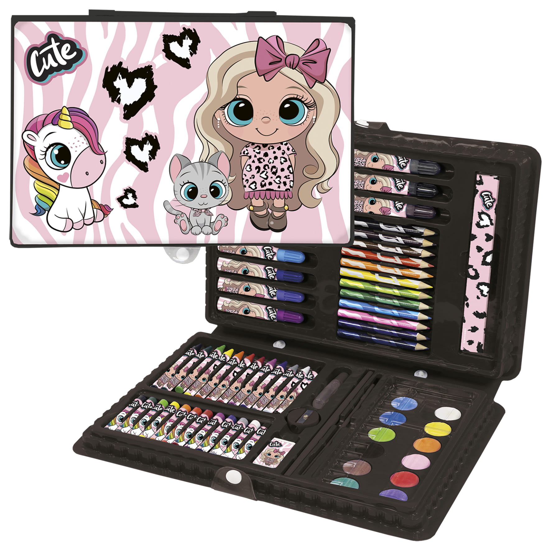 Zestaw artykułów plastycznych w walizce. W skład zestawu wchodzą: linijka, 12 pisaków, 12 kredek ołówkowych, 12 farb akwarelowych, 1 pędzel, 1 ołówek, klej, temperówka, gumka do mazania, 12 kredek woskowych, 12 pasteli woskowych + kolorowanka (4 kartki) + przeźroczysta paleta.