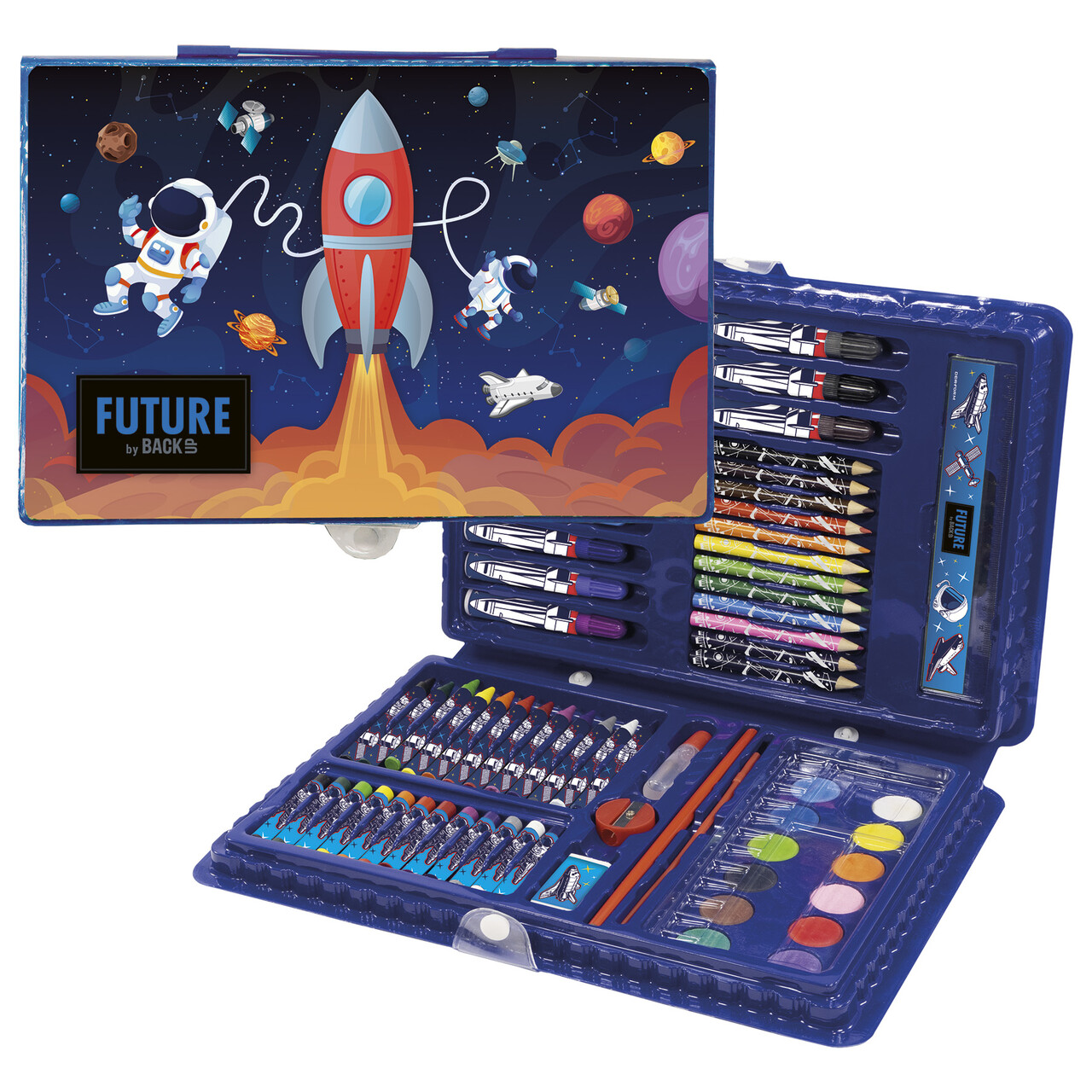 W skład zestawu wchodzą: linijka, 12 pisaków, 12 kredek ołówkowych, 12 farb akwarelowych, 1 pędzel, 1 ołówek, klej, temperówka, gumka do mazania, 12 kredek woskowych, 12 pasteli woskowych + kolorowanka (4 kartki) + przeźroczysta paleta.