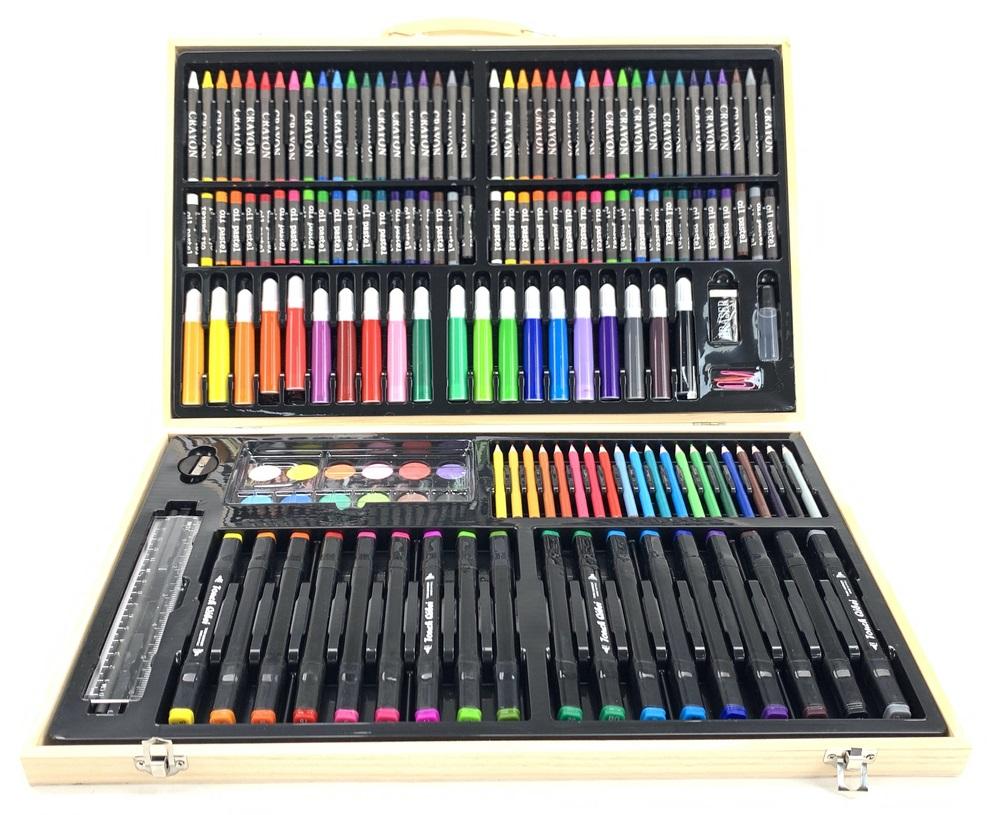 Zestaw Artystyczny Do Malowania w Drewnianej Walizce 180 elementów ! Zestaw artystyczny dla dzieci, który świetnie sprawdzi się jako prezent na każdą okazję. Rysowanie i malowanie wpływa na prawidłowy rozwoju małej motoryki dziecka. Pobudza kreatywność, ale też ćwiczy mózg dziecka i przygotowuje go do nauki pisania. Wielokolorowy zestaw kredek, farb i flamastrów pozwala na długą zabawę i umożliwia dzielenie się zawartością z innymi dziećmi. Całość zapakowana w elegancką drewnianą walizkę z metalowymi zatrzaskami. Zestaw zawiera: - 40 pasteli olejnych - 40 kredek świecowych - 20 pisaków grubszych - 36 pisaków cienkich - 20 kredek - mini gumka - 3 spinacze biurowe - klej - linijka - temperówka - 12 farb akwarelowych Wymiary opakowania: 47 cm x 29 cm x 5 cm 180 Elementów - przy pomocy ogromnego wyboru z łatwością stworzymy najbardziej wymyślne, kreatywne i oryginalne prace. Całość umieszczona jest w walizce, dzięki czemu transportowanie pełnej zawartości jest proste i komfortowe; dodatkowo posiada uchwyt umożliwiający wygodne przenoszeni. Po zużyciu pierwotnych przyborów, można z powodzeniem zapełnić walizkę nowymi, własnymi akcesoriami. Osobne przegródki dają łatwy i szybki dostęp do potrzebnych rzeczy, a także zapewniają ich ochronę oraz utrzymanie porządku w walizce; bez kłopotu zabierzemy ją ze sobą gdzie tylko zechcemy. Cały zestaw wygląda niezwykle efektownie i doskonale sprawdzi się jako prezent !