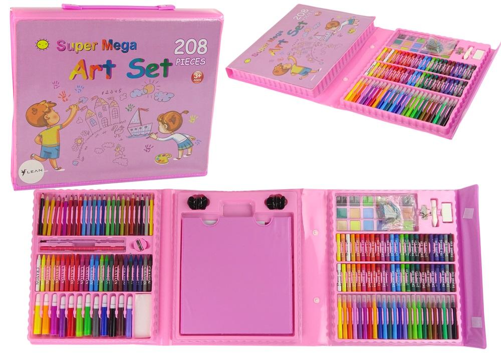 ZESTAW DO MALOWANIA XXL W WALIZCE 208 ELEMENTÓW Przy pomocy ogromnego wyboru kredek, pisaków, pasteli olejnych, pasteli świecowych, farb akwarelowych, temperówki, kleju, korektora, gumki do mazania, kartek a4 z łatwością stworzymy najbardziej wymyślne, kreatywne i oryginalne prace. Całość umieszczona jest w walizce, dzięki czemu transportowanie pełnej zawartości jest proste i komfortowe; dodatkowo posiada uchwyt umożliwiający wygodne przenoszeni. Po wykorzystaniu pierwotnych przyborów, można z powodzeniem zapełnić walizkę nowymi, własnymi akcesoriami. Pozwól dziecku wkroczyć do świata fantazji! Przenieś dziecko do, kolorowego świata dzięki któremu pobudzi własną wyobraźnię i oderwie się od wirtualnego świata. Zestaw pozwoli dziecku na kierowanie się własną fantazją i pozwoli tworzyć obrazy wróżek, kucyków i innych stworzeń z marzeń dziecka. Magiczna walizka zawiera wszystko co potrzebne do zabawy: kredki, pisaki, pastele, farby i inne przydatne do twórczości artystycznej przedmioty: linijkę, gumkę, pędzelek itp. Całość umieszczona jest w walizce, dzięki czemu transportowanie pełnej zawartości jest proste i komfortowe; dodatkowo posiada uchwyt umożliwiający wygodne przenoszenie. Wymiary zestawu : wymiary złożonej walizki: 40x30 cm wymiary rozłożonej walizki: 96x40 cm Zestaw artystyczny to propozycja nie tylko dla dzieci. Bogata paleta barw i różne rodzaje przyborów sprawdzą się podczas szkicowania, kolorowania oraz wielu innych prac. Obudź w sobie artystę i wyraź się poprzez kolor! Produkt nadaje się do stosowania w jednakowym stopniu zarówno przez osoby starsze, jak i młodsze, niezależnie od płci; komplet polecany jest do indywidualnego użytku w domu, jak również znajdzie zastosowanie jako wyposażenie prywatnych szkół oferujących kursy rysunku. Komplet do malowania i rysowania umieszczony został w dedykowanym etui - plastikowej walizce. Składa się ona na trzy części. Boczne to wytłaczane przegródki na kredki, flamastry, farby i akcesoria. Część środkowa to unoszona pod kątem tablica do rysowania. Została ona wyposażona w klipsy, umożliwiające przymocowanie kartek bloku po obu stronach. Mobilny zestaw artystyczny dla dzieci, który świetnie sprawdzi się jako prezent na każdą okazję. Rysowanie i malowanie wpływa na prawidłowy rozwoju małej motoryki dziecka. Pobudza kreatywność, ale też ćwiczy mózg dziecka i przygotowuje go do nauki pisania. Wielokolorowy zestaw kredek, farb i flamastrów pozwala na długą zabawę i umożliwia dzielenie się zawartością z innymi dziećmi. Wgłębienia w opakowaniu uczą malucha porządku, co ucieszy każdego rodzica. W skład zestawu wchodzą: - walizka - 12 grubych markerów - 24 kredki ołówkowe - 24 kredki woskowe - 48 pasteli olejnych - 18 kolorów farb akwarelowych - 24 pisaki - 1 linijka - 34 spinacze - 1 pędzel - 1 temperówka - 1 gumka - 4 klipsy - 1 ołówek - 1 paleta - 1 klej - 15 kartek A4 - 1 gąbka
