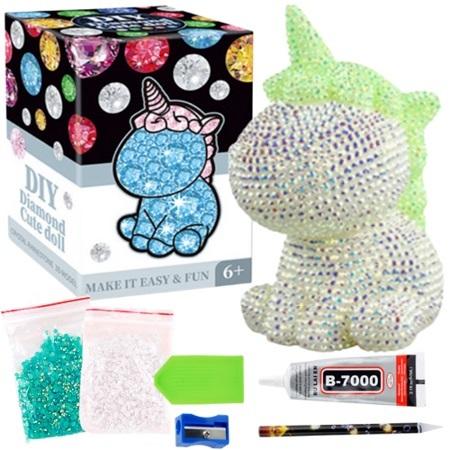 W zestawie znajduje się figurka jednorożca, która stanowi bazę do wyklejania kryształkami.