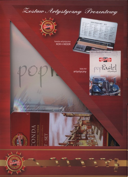Zestaw prezentowy w ozdobnym pudełku: Zestaw artystyczny Gioconda w metalowej kasetce, zawiera: - pastelę białą w drewnie GIOCONDA WHITE CHALK 8801 - sepie w drewnie RED CHALK 8802, SEPIA DARK 8804 - węgiel w drewnie GIOCONDA CHARCOAL 8810/2 - pastelę czarną w drewnie GIOCONDA NEGRO 8815/2 - ołówki bezdrzewne PROGRESSO 8911 6B - pastelę suchą TOISON D'OR 8500/52 SIENA, - pastelę suchą TOISON D'OR 8500/12 CZERŃ KOSTNĄ - rozcieracz do pasteli cienki 9477 - gumkę chlebową 6423. Blok Pop Pastel Blok z papieru fakturowanego, przeznaczone do rysowania pastelami suchymi, sepią, węglem i ołówkiem oraz innymi technikami suchymi wymagającymi papieru z fakturą.