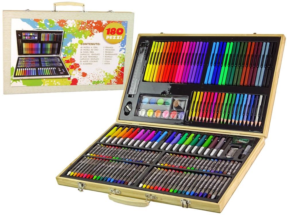 Zestaw Artystyczny Do Malowania Drewniana Walizka 180 Elementów Rozbudź wyobraźnie oraz kreatywne zdolności swojego dziecka z zestawem artystycznym. Magiczna walizka zawiera wszystko co potrzebne do zabawy: kredki, pisaki, pastele, farby i inne przydatne do twórczości artystycznej przedmioty: linijkę, gumkę, pędzelek itp. Korzyści płynących z rysowania jest wiele, to idealny sposób na rozwijanie umiejętności motorycznych i umysłowych u dzieci. Wzmacnia ich rozwój eksploracyjny, psychologiczny i emocjonalny. Tworzenie to sposób na obserwowanie rozwoju dziecka, rozwija wrażliwość, stymuluje koncentrację i wspomaga uważne obserwowanie oraz inteligencję emocjonalną. W naszym zestawie artystycznym znajdzie się coś dla każdego - pisaki do kolorowania, kredki do rysowania oraz farbki do malowania. Wszystko to w nasyconych barwach, które doskonale prezentują się na papierze. Całość zamknięta w wygodnej walizce, którą z łatwością można złożyć, zamknąć i zabrać ze sobą - do szkoły, przedszkola, na zajęcia plastyczne czy na wycieczkę, aby malować w plenerze! Zestaw artystyczny to propozycja nie tylko dla dzieci. Bogata paleta barw i różne rodzaje przyborów sprawdzą się podczas szkicowania, kolorowania oraz wielu innych prac. Obudź w sobie artystę i wyraź się poprzez kolor ! Zalety zestawu: - Kredki, pastele i pisaki w doskonałe jakości, mają żywe, intensywne kolory, nie blakną i doskonale rozprowadzają się na powierzchni - Pisaki, które długo zachowują swoje właściwości ( nie wysychają a ich końcówki nie rozwarstwiają się) - Markery i kredki w rozmiarach odpowiednich dla ręki dziecka, dzięki nim rysowanie jest wygodne. - Pisaki można łatwo usunąć z gładkich powierzchni zmywalnych takich jak blaty, okleiny, plastik - Szeroko gama kolorystyczna sprawia, że dziecko może nieskrępowanie rozwijać wyobraźnie - Wygodna walizka do porządkowania i przenoszenia wszystkich elementów zestawu ze składaną podkładką do przypięcia kartek W zestawie znajdziemy: - walizka - 40 pasteli olejowych - 40 pasteli świecowych - 12 akwarel - 20 kredek ołówkowych -20 maxi markerów - linijka - temperówka - gumka - spinacze - klej Wymiary walizki: 48 cm x 30 cm x 6 cm Wymiary opakowania: 50 cm x 32 cm x 7 cm Przeznaczony dla dzieci powyżej 3 roku życia. Zgodny z normą EN71 i certyfikatem CE.