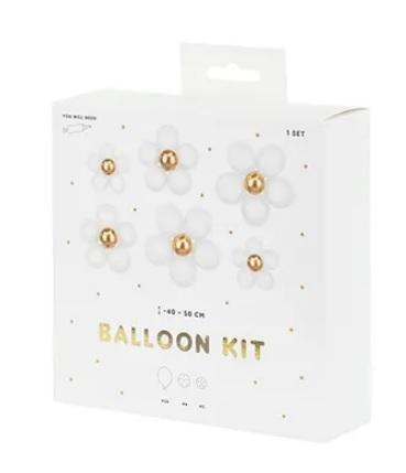 Zestaw balonów lateksowych Kwiaty, zestaw zawiera 6 balonów w kolorze złotym, 30 balony w kolorze białym oraz 4 kółka w rozmiarze 13 cm i 2 kółka w rozmiarze 11 cm do mocowania balonów. Wymiary kwiatów po złożeniu ok. 40 cm, 45 cm, 50 cm.