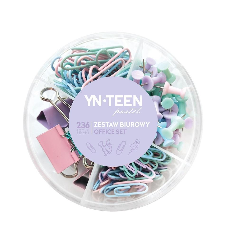 Pastelowy zestaw biurowy 236 elementów w kompaktowym, funkcjonalnym pudełku. W zestawie: małe spinacze 100 szt., duże spinacze 50 szt., klipy 6 szt., pinezki tablicowe 80 szt.
