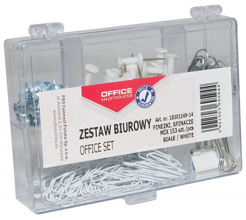 zestaw biurowy w praktycznym organizerze w skład zestawu wchodzi pinezka tablicowa (20 szt.), spinacz metalowy 26 mm (25 szt.), spinacz kolorowy 26 mm (70 szt.), pinezka metalowa (35 szt.), clip 19 mm (3 szt.) 153 szt. w j.s. kolor: biały