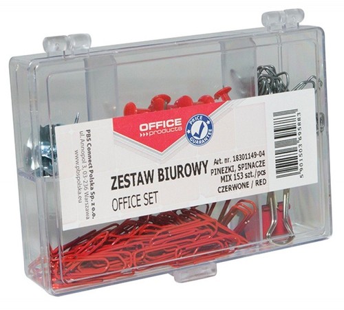 zestaw biurowy w praktycznym organizerze w skład zestawu wchodzi pinezka tablicowa (20 szt.), spinacz metalowy 26 mm (25 szt.), spinacz kolorowy 26 mm (70 szt.), pinezka metalowa (35 szt.), clip 19 mm (3 szt.) 153 szt. w j.s. kolor: czerwony