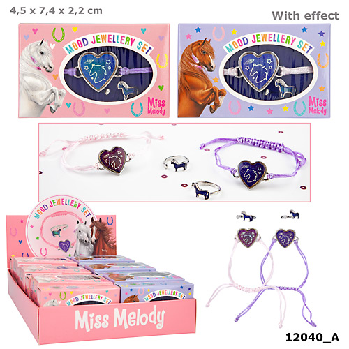 Zestaw biżuterii pokazującej nastrój Miss Melody, w zestawie pierścionek i bransoletka, w ozdobnym pudełeczku. Można regulować rozmiar pierścionka i bransoletki.