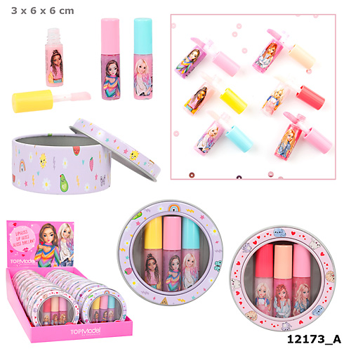Zestaw 3 błyszczyków w metalowym pudełku Top Model. Błyszczyki w różnych owocowych smakach. Pojemność 3x1,2ml. 2 wzory do wyboru różowe pudełko lub fioletowe pudełko.