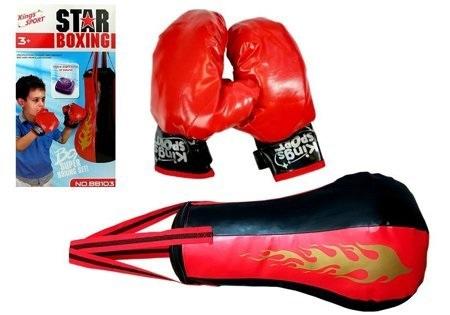 Zestaw Bokserki Duży Jeżeli Twoje dziecko jest zainteresowanie sportem to nie ma na co czekać. Doskonałym prezentem będzie zestaw bokserski. Świetna zabawa i niezapomniany trening w jednym. Zestaw rozwija koordynację ruchową, szybkość, zwinność i zdolność uników. Wyszczupla sylwetkę, świetnie poprawia motorykę i szybkość dziecka. Zestaw treningowy do boksowania składający się z worka bokserskiego i rękawic. Dołączone rękawice są w rozmiarze uniwersalnym, pasujące na dziecięcą rękę. Zestaw utrzymany jest w kolorystyce czarno-czerwonej z pięknymi dodatkami żółtego. Zestaw jest uniwersalny, sprawdzi się zarówno dla dziewczynek, jak i chłopców. Zestaw bokserski zawiera: - worek bokserski - rękawice bokserskie - zapinane na rzep Wymiary elementów zestawu: - worek bokserski: wysokość - 45 cm, średnica - 27 cm - rękawice bokserskie: długość - 24 cm, szerokość - 11 cm, długość kciuka - 6 cm Wymiary pudełka: 50 cm x 27 cm x 27 cm Zestaw przeznaczony jest dla dzieci powyżej 3. roku życia. Zabawki posiadają certyfikat CE i są zgodne z normą EN 71. Zapakowane są w kolorowe pudełko, dzięki czemu nadają się na prezent dla dziecka.