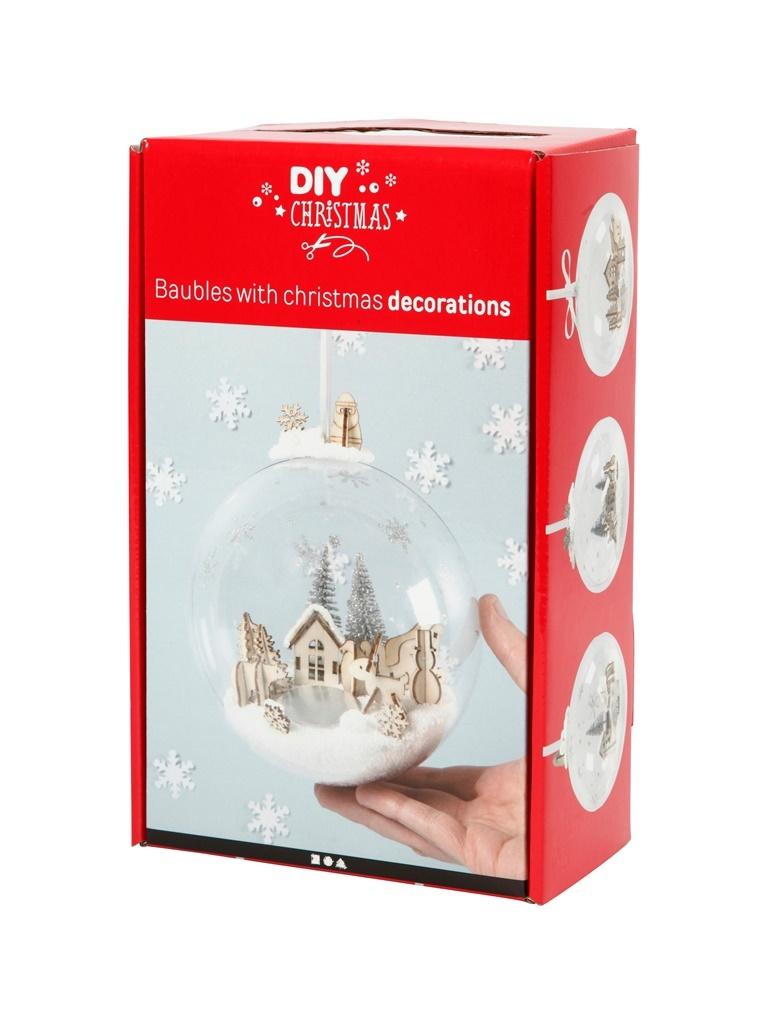 Zestaw z 1 przezroczystą plastikową bombką do zawieszania. Zawiera różne materiały, aby stworzyć małą świąteczną scenę wewnątrz bombki. W zestawie znajduje się: drewniana deska z wyciętymi figurkami, satynowa wstążka, klej brokatowy, 2 srebrne choinki, metalowa karta, 70g piankowej masy plastycznej i 1 marker.