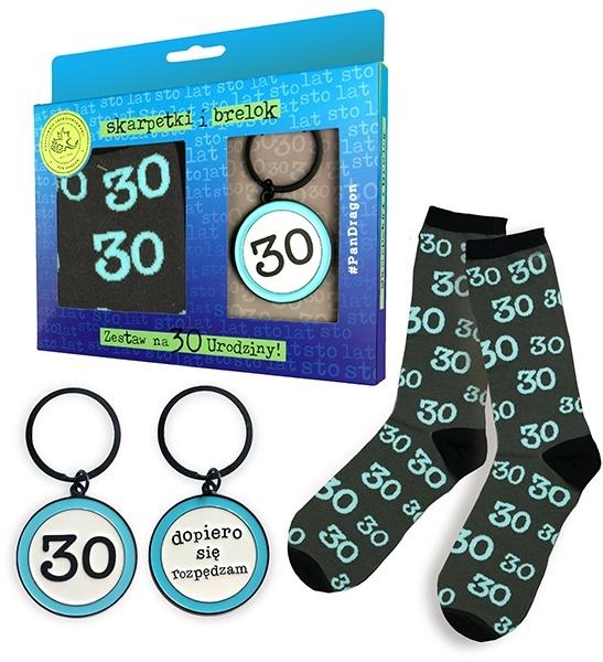 Zestaw składający się ze skarpet i breloka zapakowanych w eleganckie pudełko.
