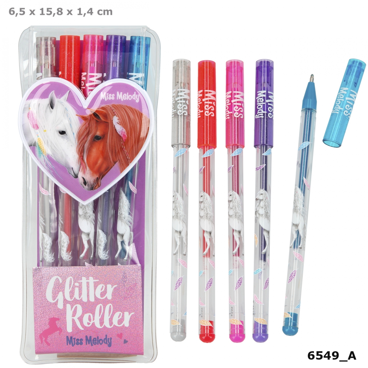 Zestaw 5 brokatowych żelpenów Miss Melody, z wizerunkiem koników.