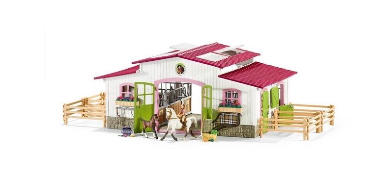 Stajnia z akcesoriami. Bogato wyposażony budynek stajni wykonany został z najwyższej jakości plastiku. Elementy można łączyć wtykowo, bez materiałów pomocniczych. W stajni znajdują się boksy dla zwierząt, otwierane drzwi do boksów, otwierana brama oraz okna dachowe. Konstrukcja stajni pozwala także na zbudowanie padoku z zadaszeniem, czy wiaty np. na samochód i przyczepę dla konia. Dach stajni można zdejmować.