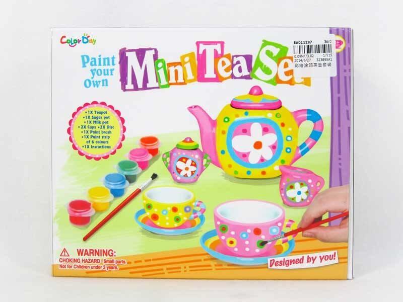 Zestaw ceramiczny do malowania, zawiera: 1 czajniczek, 1 cukiernica, 1 dzbanek na mleko, 4 kubki, 4 podstawki, 1 pędzel, 6 kolorów farb, instrukcja. Produkt nie potrzebuje baterii. Zabawka przeznaczona dla dzieci powyżej 3 roku życia.