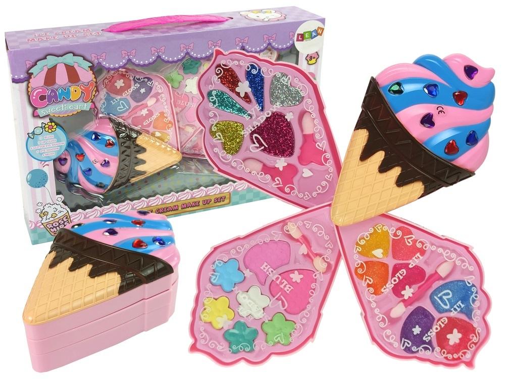 Dziewczynka może wybrać spośród kilkunastu cieni do powiek, jak dziś pomaluje się na wielkie wyjście. Wszystko znajduje się w przepięknym pudełeczku w kształcie kolorowego loda przyozdobionym serduszkami. Składa się z 3 paletek, jedna z błyszczykami, druga z cieniami i różami, a kolejna z brokatowymi cieniami. Każdą z nich można obrócić o 360 stopni.