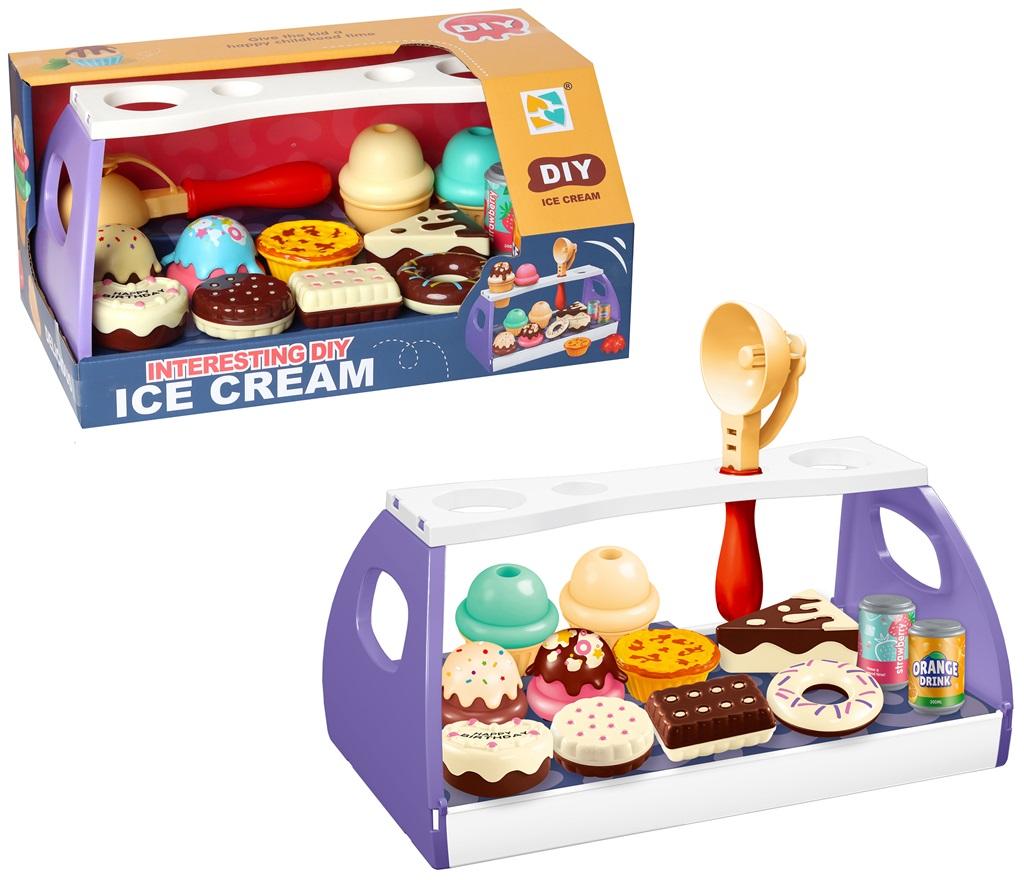 Ładny, kolorowy zestaw do zabawy w cukiernię. W zestawie lada oraz zestaw kolorowych ciasteczek, ciast i lodów.