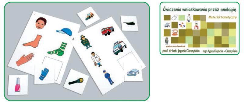 Analogia to metoda rozumowania, w której szuka się tych samych relacji w różnych sytuacjach, bądź stosuje się te same schematy rozumowania w odmiennych warunkach.     Analogia ułatwia transfer (przenoszenie)  wiedzy i szczegółowych rozwiązań z jednego problemu na drugi, a nawet z jednej dziedziny na zupełnie inną. Obok kategoryzacji analogia stanowi istotny wymiar rozwoju intelektualnego człowieka.    Myślenie przez analogię warunkuje skuteczne uczenie się odmiany wyrazów i umiejętność budowania zdań gramatycznie poprawnych, przyswajanie reguł społecznych i ich stosowanie w kontaktach indywidualnych i grupowych.Ponieważ myślenie przez analogie wymaga:    ⁃    dostrzeżenia relacji,    ⁃    dostrzeżenia różnic,    ⁃    dokonania analizy,    ⁃    odkrycia reguły,    ⁃    wykorzystania reguły,jest ono przede wszystkim zależne od funkcji lewej półkuli mózgu.     Ćwiczenia rozumowania przez analogię powinny być prowadzone w przypadkach zaburzeń komunikacji językowej, zakłóceń uwagi i koncentracji oraz w sytuacji specyficznych trudności w czytaniu i pisaniu.    W zależności od zastosowanego materiału analogie można podzielić na: atematyczne (abstrakcyjne), tematyczne, językowe (na materiale werbalnym).       Pomoc ""Ćwiczenia wnioskowania przez analogię"" składa się z szesnastu tablic. Do każdej z nich przypisane są trzy obrazki, spośród których należy wybrać ten, który pasuje w puste miejsce na tablicy. Każda tablica ilustruje jedną regułę, którą dziecko musi zaobserwować na podstawie dwóch par obrazków i zastosować w odniesieniu do trzeciej pary. Tablice różnią się trudnością - dla każdego dziecka trudność analogii jest warunkowana przede wszystkim doświadczeniem.