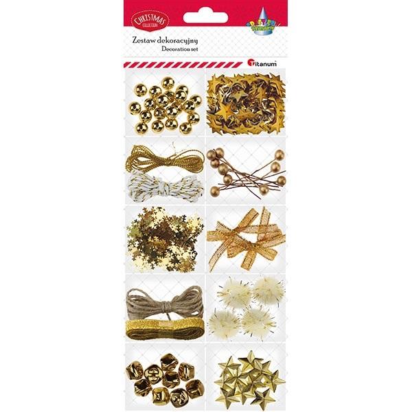 Zestaw dekoracji 12 rodzajów złoty: koraliki, dzwoneczki, gwiazdki 3D, pompony poliestrowe, kuleczki na druciku, kokardki brokatowe ze wstążki z lureksem, wstążka brokatowa z lureksem, wstążka satynowa, sznurek pleciony, sznurek bałweniany skręcany, konfetti płatki śniegu, cekiny gwiazdki