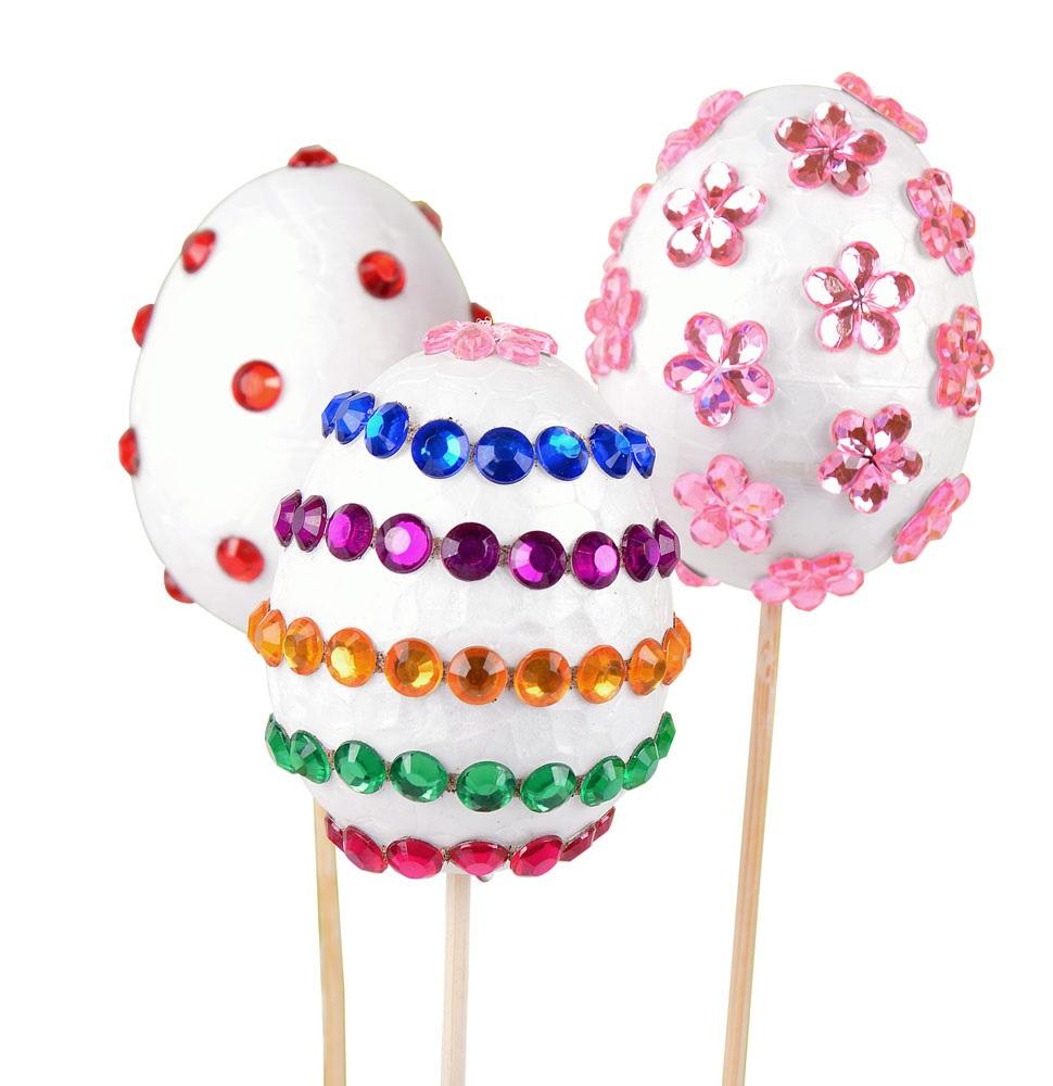 Komplet elementów do samodzielnego wykonania ozdoby na piku. W zestawie znajdują się 4 styropianowe jajka wielkości 6 cm, patyczki i kryształki (różne wzory i kolory).