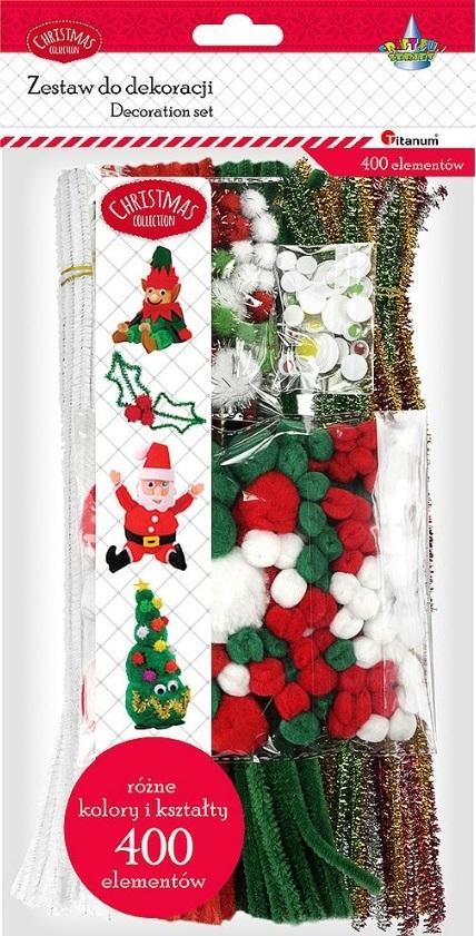 Zestaw 400 elementów: 120 drucików chenillowych (złote, czerwone, srebrne, zielone, czerwone, białe), 170 pomponów: akrylowe, poliestrowe, brokatowe, 30 ruchomych oczek kolorowych.