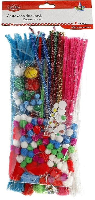 Zestaw 400 elementów: 120 drucików chenillowych, 170 pomponów: akrylowe, poliestrowe, brokatowe; 30 ruchomych oczek kolorowych.