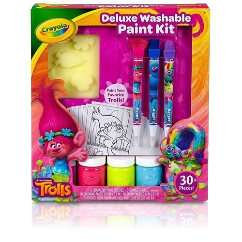Zestaw Deluxe ze zmywalnymi farbami zawiera wszystko co potrzebne do kolorowania scen z filmu Trolle. Wybierz pędzel oraz postać i pokoloruj obrazek! W zestawie znajduje się podwójnie zakończony pędzel, który pozwala na tworzenie wielu stylów malowania. Wiek: 3+ Zawartość: 3 butelki farby 3 pędzle ze specjalnymi końcówkami Arkusze papieru z Trollami Gąbki do malowania