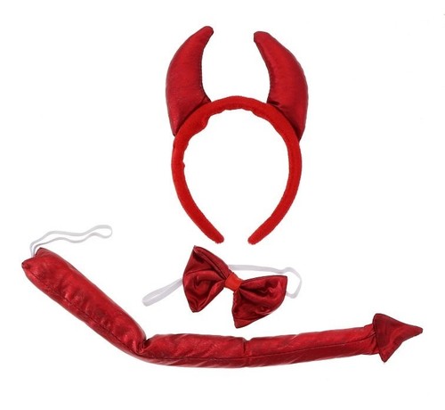Zestaw Diabeł Satynowy Zestaw satynowy w kolorze czerwonym zawiera: opaskę z rogami, muszkę oraz ogon. Wykonany z miękkiego materiału. Elastyczność opaski pozwoli na dopasowanie się do każdej głowy.