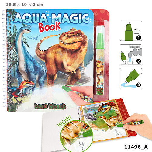 Zestaw Aqua Magic Dino World z flamastrem do napełniania wodą. Po pomalowaniu obrazka pojawiają się ukryte motywy, gdy papier wyschnie obrazki znikają.