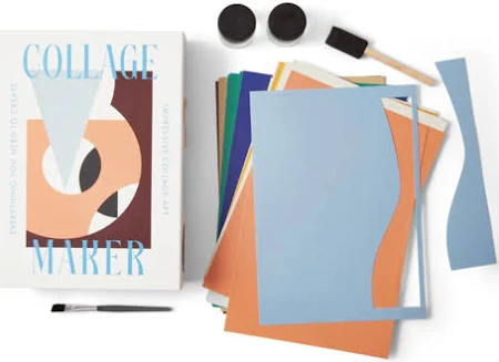 Zestaw do tworzenia kolaży zawiera: 5 arkuszy białego, wysokiej jakości papieru o gramaturze 350 gramów do nanoszenia kolaży, 55 unikalnych kształtów na kolorowym papierze o gramaturze 350 gramów, 2 puszki przezroczystego kleju, 1 x cienki pędzelek, 1 x pędzelek z gąbką (do pokrycia większych obszarów klejem).