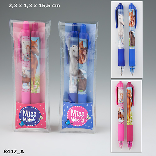 Zestaw długopisów Miss Melody. Dwa długopisy kulkowe z motywem koników w plastikowym etui.