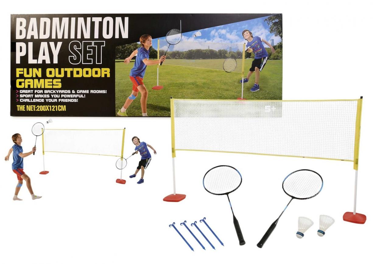 W zestawie: 2 paletki, 2 lotki, stelaż, siatka, łączenia, podstawki do dociążenia wodą, linki, śledzie, funkcje: samodzielny montaż stelaża z siatką, umożliwia 2 osobową grę w badmintona, dociążane podstawki ze zbiornikiem na wodę, wym. po rozłożeniu 200 x 121 cm, wym. opak. 61 x 23 x 8,5 cm, 5+