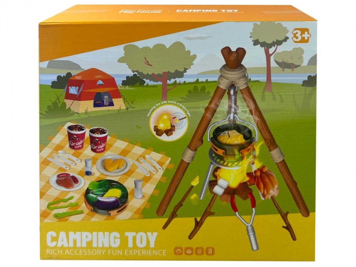 Fantastyczny zestaw kempingowy dla małych miłośników przygód na świeżym powietrzu. W komplecie znajduje się ognisko z efektem świetlnym, trójnóg z garnkiem oraz liczne akcesoria do zabawy w gotowanie na biwaku. Zabawka rozwija wyobraźnię, kreatywność i zachęca do odgrywania scenek tematycznych. Efekt świecącego ogniska sprawia, że zabawa staje się jeszcze bardziej realistyczna i atrakcyjna dla dziecka. Idealny pomysł na prezent dla dzieci od 3. roku życia. Cechy produktu: Efekt świetlny imitujący ognisko; Bogaty zestaw akcesoriów (garnek, jedzenie, sztućce itp.); Rozwija kreatywność i umiejętności społeczne. Wiek: 3+. Wymiary opakowania: ok. 30 30 9 cm. Wysokość trójnogu (po złożeniu): ok. 25-30 cm.