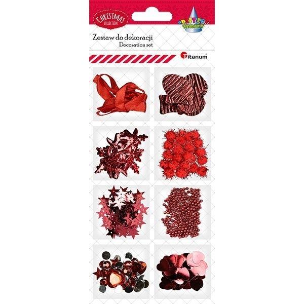 Zestaw do cardmakingu 8 rodzajów czerwony: wstążka, naklejki tektura falista, dekoracje materiałowe, pompony, konfetti, koraliki, kryształki