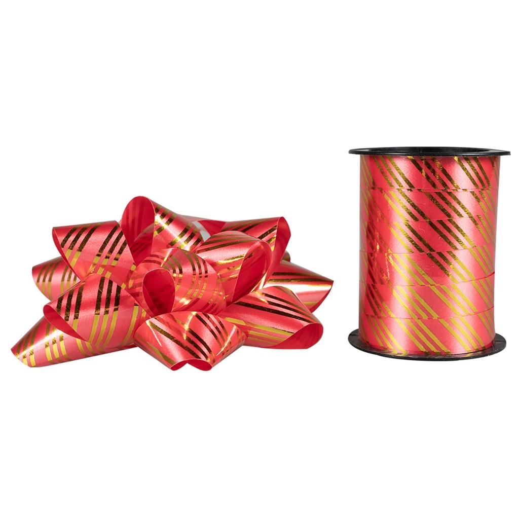 Zestaw do dekoracji prezentów wykonany z tworzywa sztucznego w kolorze czerwonym. W skład zestawu wchodzi rozeta oraz wstążka na szpuli. Produkt zdobiony jest złotymi, drobnymi paseczkami. Komplet do pełnej dekoracji opakowanego prezentu. Wymiary produktów: rozeta 10 cm, długość taśmy 100 cm.