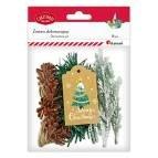 Zestaw do dekoracji prezentu: girlanda plastikowa długość 45cm, gałązki żywotnika ośnieżone 6szt., szyszki plastikowe 25x32mm 5szt., sznurek jutowy ok. 3m, zawieszka prezentowa 40x70mm 1szt.