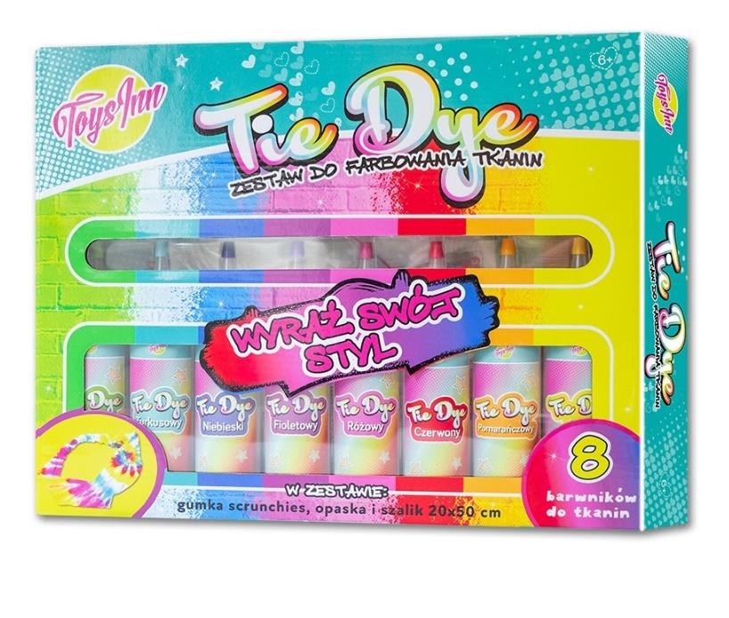 Zestaw zawiera 8 butelek z barwnikiem do tkanin po 5,2 g (żółty, pomarańczowy, czerwony, różowy, fioletowy, niebieski, turkusowy, zielony), bawełnianą, białą apaszkę 20x50cm, opaskę na włosy, gumkę scrunchies, rękawiczki - 3 pary, obrus 91x91 cm, gumki - 30 szt, instrukcję.
